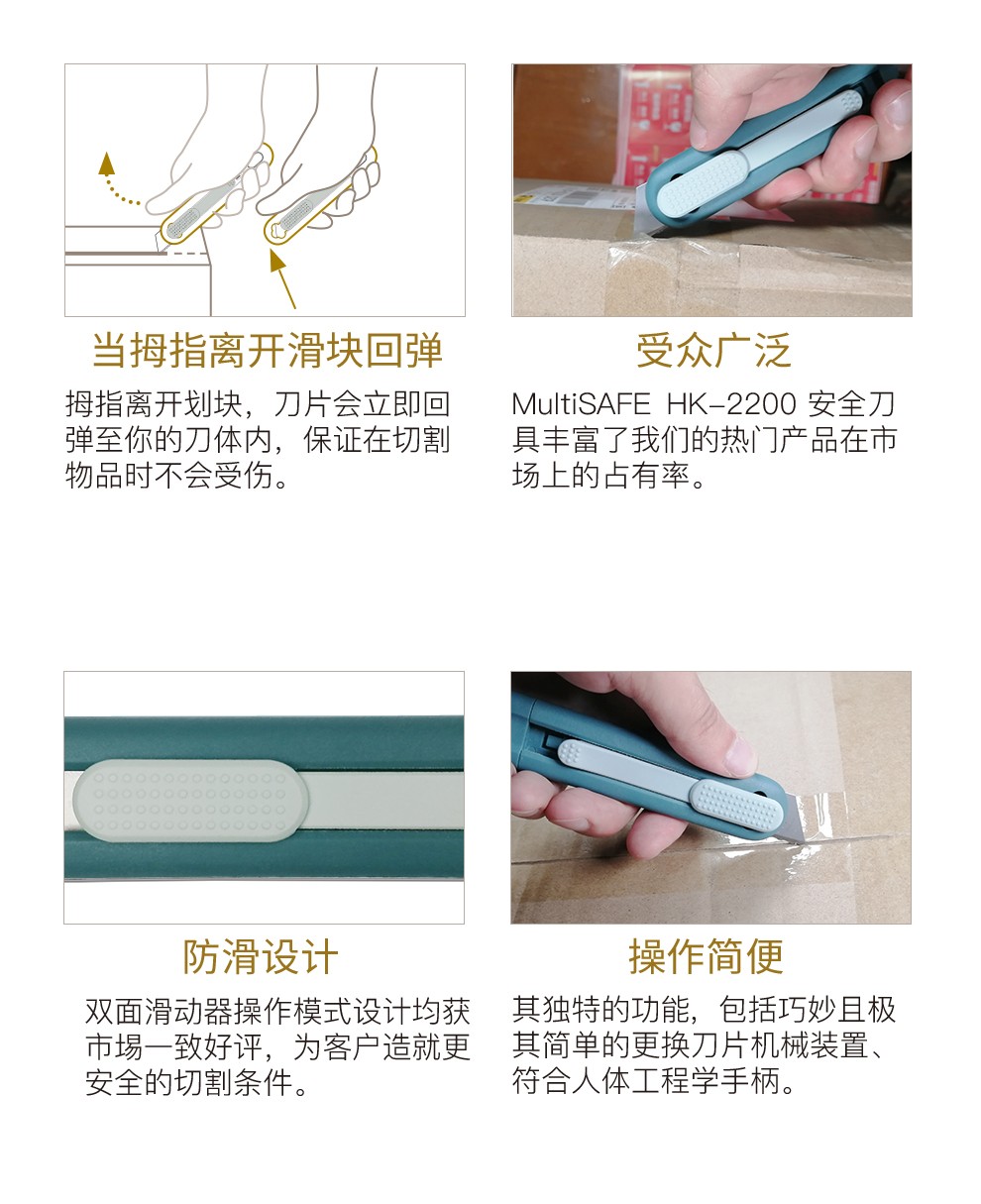 HEWER 很高興地宣布推出我們革命性的全新MultiSAFE HK-2200輕巧型安全刀具。這款創新、靈巧的安全刀具豐富了我們廣受歡迎的開箱刀系列,并自豪地專為工廠、辦公室及家庭應用而設計。獨特的功能包括設計巧妙且極其簡單的刀片更換系統。其他亮點包括其人體工程學手柄,其中單側滑塊設計讓左、右撇子亦能靈活使用。。